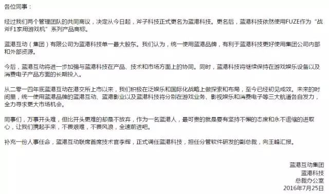 2016年7月25日,斧子发布会大约2个月后,“斧子科技”正式改名为“蓝港科技”。蓝港在内部邮件中称:“改名是为了统一品牌”。蓝港是斧子的主要投资方,蓝港CEO王峰也是斧子的CEO。改名后,“战斧F1”成了蓝港科技旗下一条产品线。