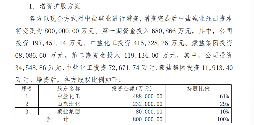 可以看出,中盐化工在此次增资中占据主导地位,这也意味着山东海化的话语权或将偏弱。