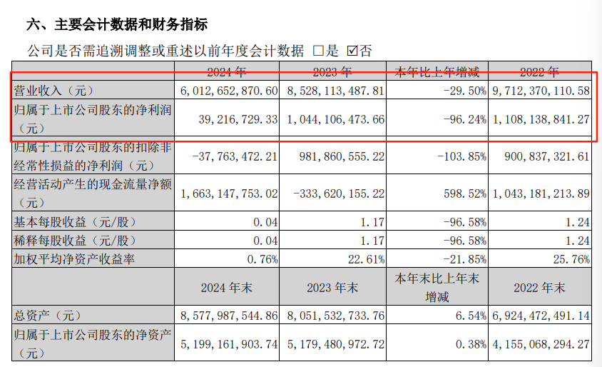 从2022年至2024年,山东海化营收分别为97.12亿元、85.28亿元、60.13亿元;归属于上市公司股东的净利润分别为11.08亿元、10.44亿元、3921.67万元,尤其从2023年到2024年,净利大幅减少96.24%。