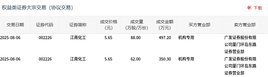 8月6日,江南化工大宗交易成交150万股,成交额847.5万元,占当日总成交额的2.62%,成交价5.65元,较市场收盘价6.21元折价9.02%。