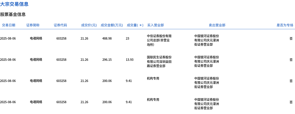 8月6日,电魂网络大宗交易成交55.75万股,成交额1185.25万元,占当日总成交额的5.91%,成交价21.26元,较市场收盘价23.74元折价10.45%。