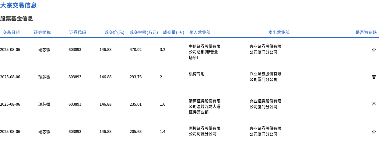 8月6日,瑞芯微大宗交易成交8.2万股,成交额1204.42万元,占当日总成交额的1.03%,成交价146.88元,较市场收盘价163.2元折价10%。
