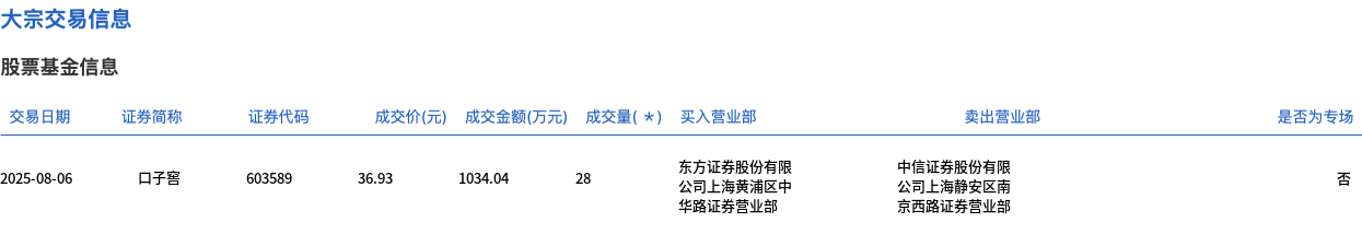 8月6日,口子窖大宗交易成交28万股,成交额1034.04万元,占当日总成交额的9.44%,成交价36.93元,较市场收盘价33.53元溢价10.14%。