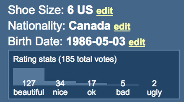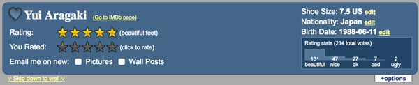 手动筛选,可以看到网站里所有脚的总排名,最受欢迎的脚来自Megan Fox。▼