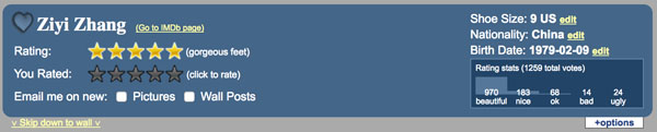 章子怡的脚,有970人认为“漂亮”,综合评价为“极美的脚”。▼