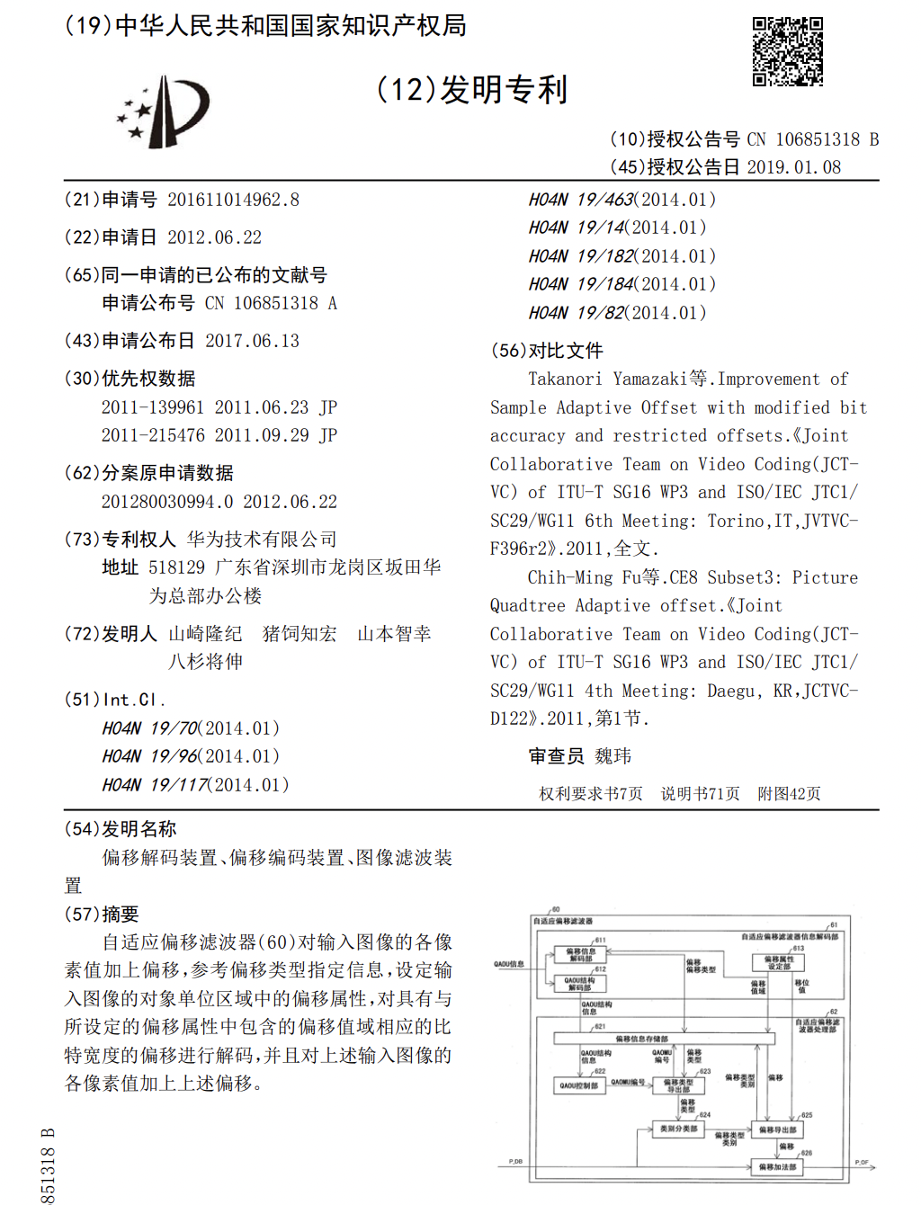 参考国家知识产权局对华为 “偏移解码装置、偏移编码装置、图像滤波装置” 专利(专利号:CN106851318B)的解释,该专利主要通过限制偏移位深度和范围来解决自适应偏移滤波器中的存储器效率低下问题。