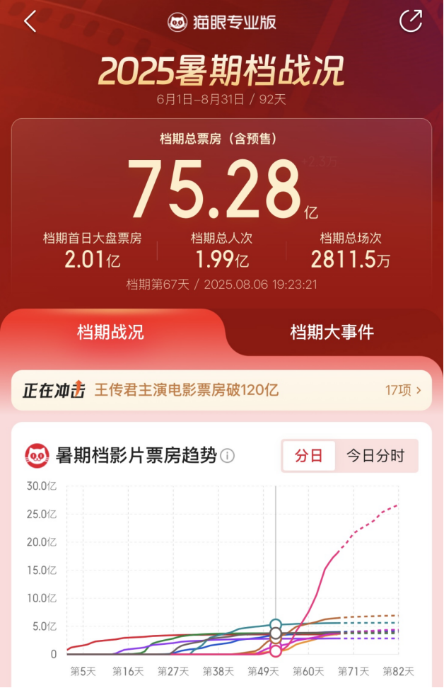 2025年暑期档时间是6月1日到8月31日,共92天,从实时数据来看,到了60天左右才由《南京照相馆》来拉高大盘,同期对比来看,也是近三年最差。