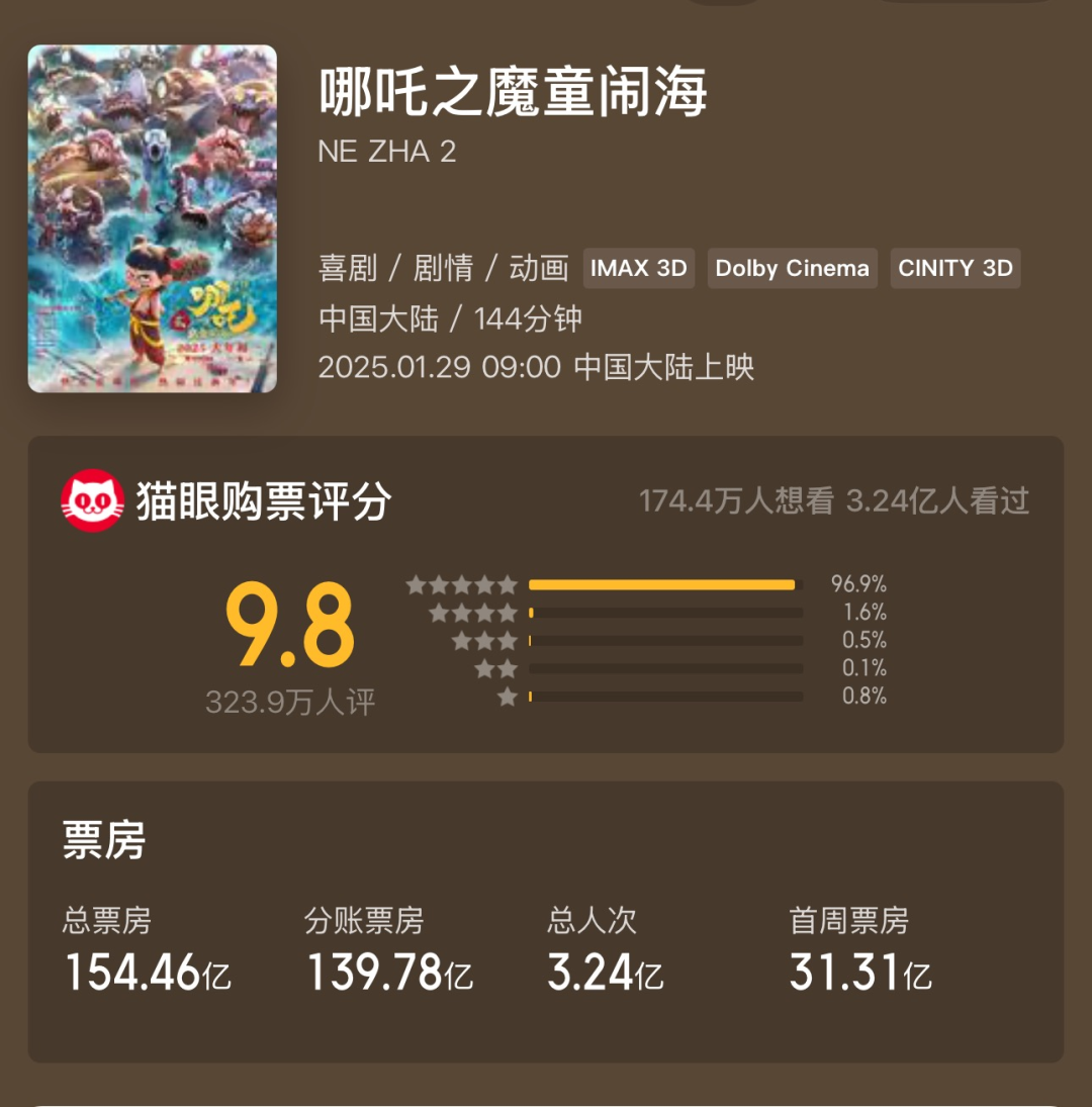 光线传媒的董事长王长田就表示,《哪吒2》在票房之外的收入远比票房更加惊人。“如果不是盗版,我认为上千亿的哪吒衍生品销售规模是完全有可能的。”