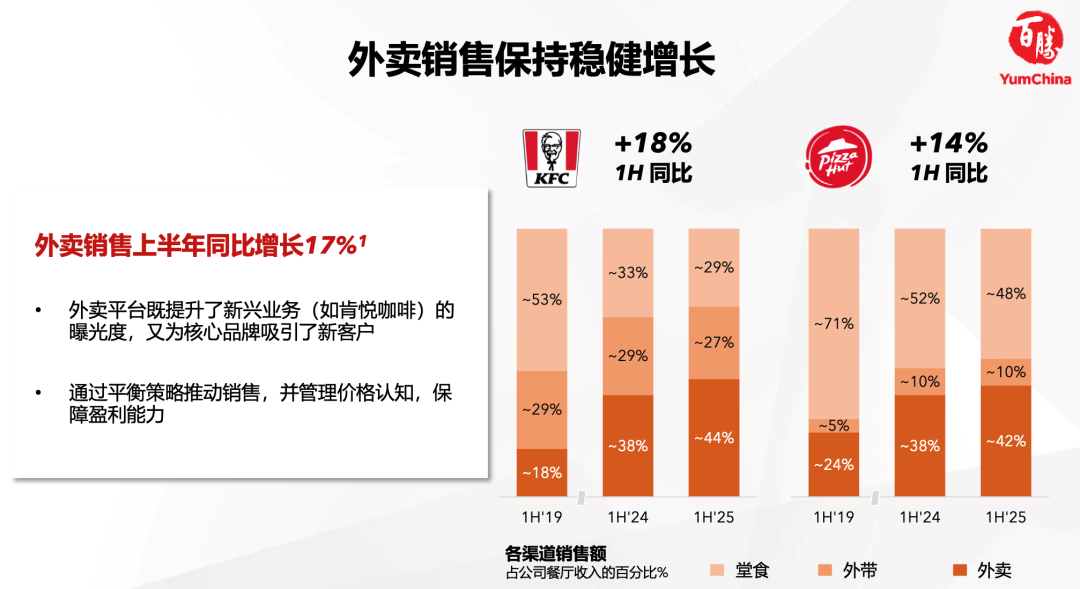 财报显示,上半年,百胜中国外卖销售同比增长17%,其中肯德基增长18%,必胜客增长14%。