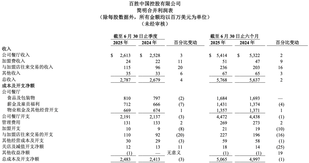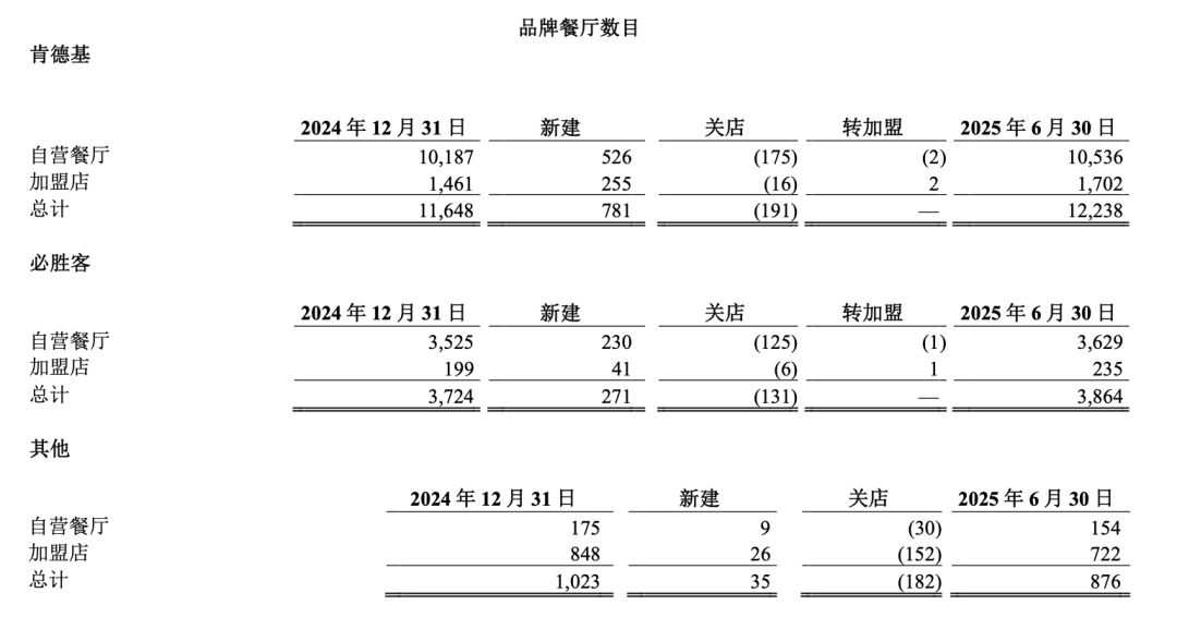 此外,百胜中国表示,2025年全年净新开门店的特许经营店比例将与上半年类似,即肯德基为41%,必胜客为26%。