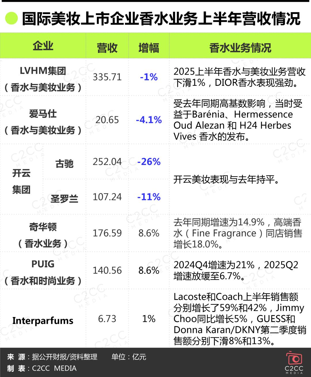 一如LVHM集团(2025H1香水与美妆业务营收下滑1%)、爱马仕(2025H1香水与美妆业务营收下滑4.1%)、开云集团(2025H1核心业务古驰Gucci和圣罗兰Yves Saint Laurent营收跌幅均超两位数)等国际奢侈品巨头旗下香氛业务,从引领业绩增长的“香饽饽”,逐渐滑落为负增长。
