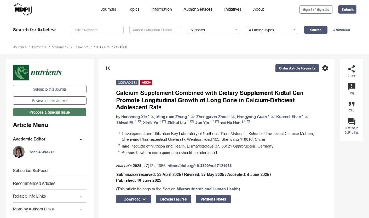 《Nutrients》发表inne竹节钙专利成分Kidtal®的研究成果