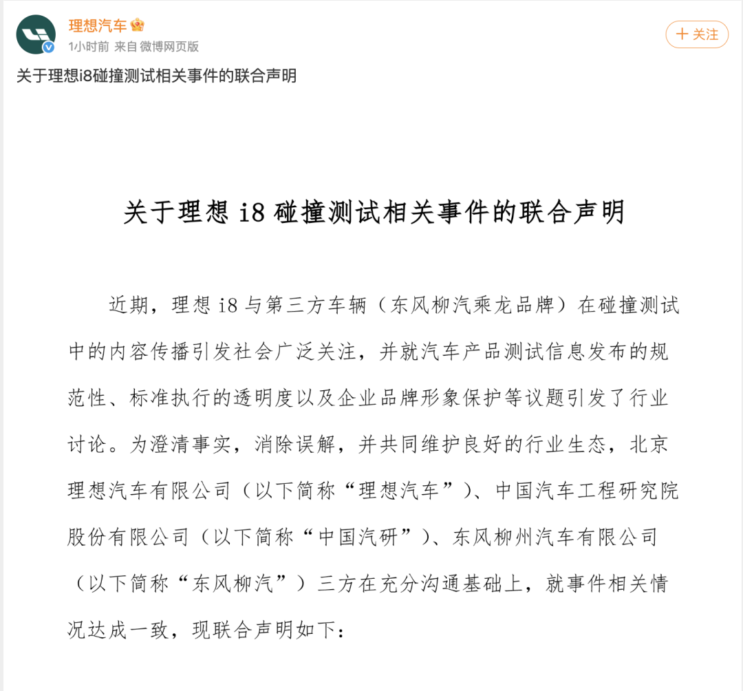 8月6日晚间,一份有关《关于理想i8碰撞测试相关事件的联合声明》刷屏,理想汽车和中国汽研诚挚道歉,东风柳汽大度接纳,三方倡议共塑良性竞合。