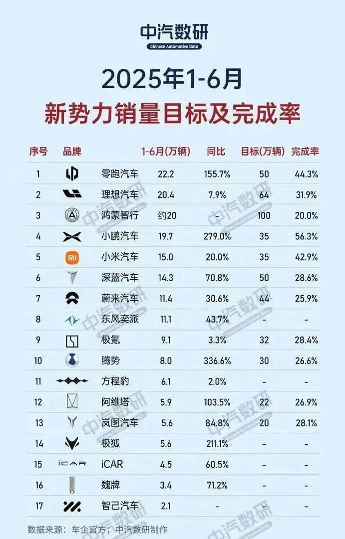 理想汽车上半年销量落后零跑。图片来自中汽数研。