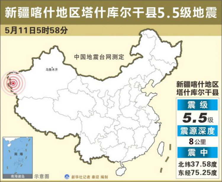 今晨5时58分新疆喀什地区塔什库尔干塔吉克自治县发生5.5级地震。
