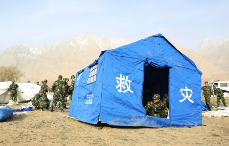 在新疆喀什地区塔什库尔干塔吉克自治县库孜滚村,救援人员在搭建帐篷。