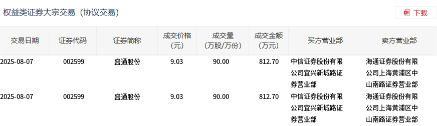 8月7日,盛通股份大宗交易成交180万股,成交额1625.4万元,占当日总成交额的4.77%,成交价9.03元,较市场收盘价9.5元折价4.95%。