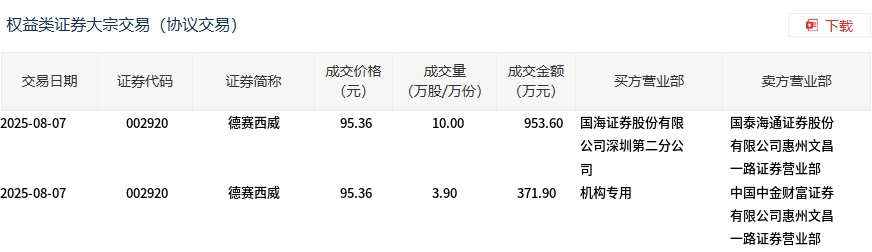 8月7日,德赛西威大宗交易成交13.9万股,成交额1325.5万元,占当日总成交额的2.98%,成交价95.36元,较市场收盘价104.65元折价8.88%。