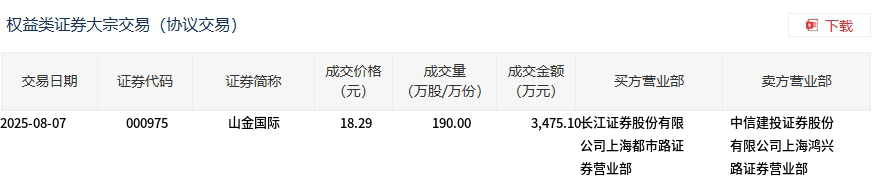 山金国际今日大宗交易折价成交190万股,成交额3475.1万元