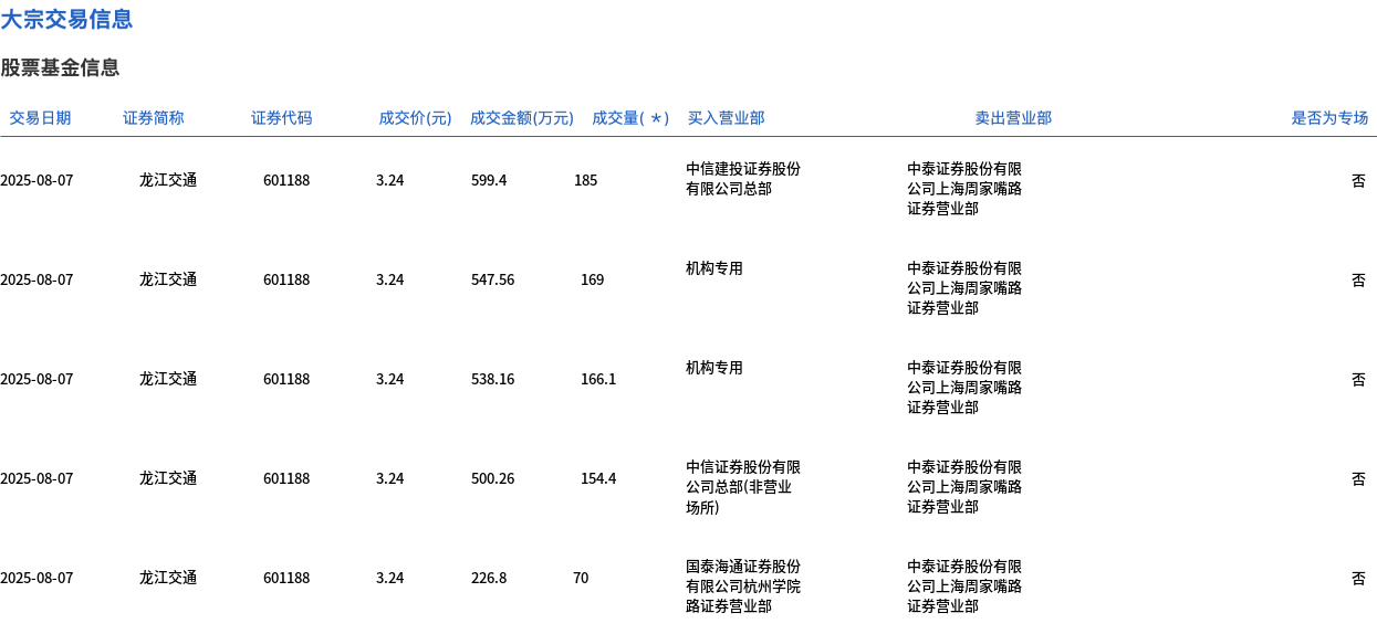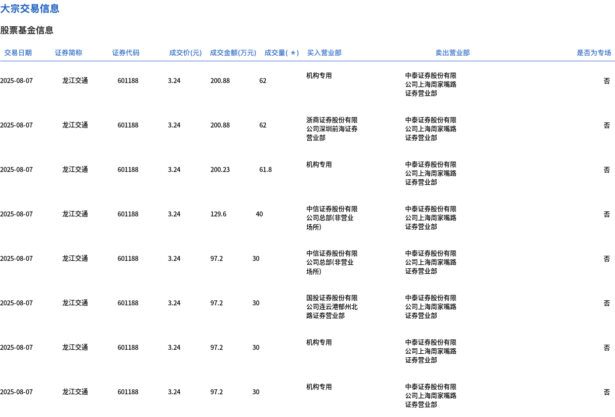 8月7日,龙江交通大宗交易成交1090.3万股,成交额3532.57万元,占当日总成交额的36.27%,成交价3.24元,较市场收盘价3.52元折价7.95%。