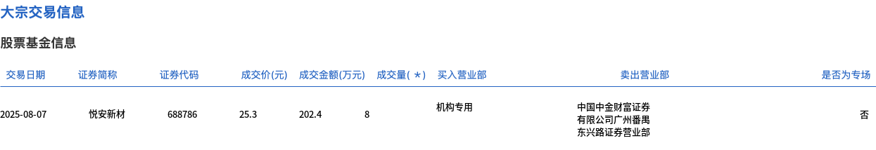 8月7日,悦安新材大宗交易成交8万股,成交额202.4万元,占当日总成交额的1.35%,成交价25.3元,较市场收盘价27.8元折价8.99%。