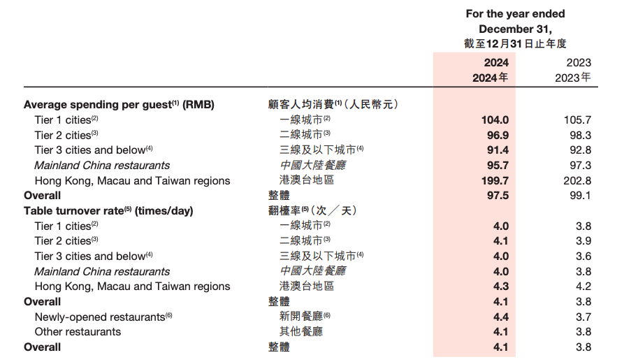 由于定位中高端,客单价不菲,为吸引消费者买单,海底捞不得不降价求生。财报显示,2022年-2024年,海底捞客单价分别为104.9元、99.1元以及97.5元,不断下行。