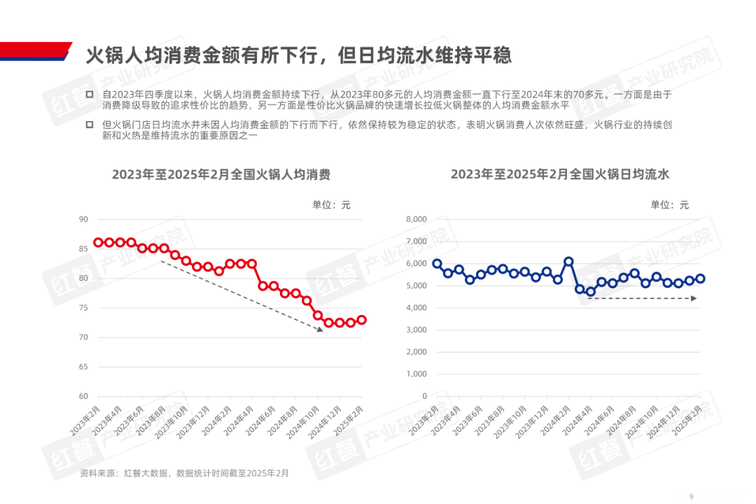 更令火锅从业者感到焦虑的是,因经济承压,消费者的消费能力还不断走低。红餐产业研究院统计的数据显示,近年来,火锅人均消费金额持续下行,从2023年80多元一路下行至2024年末的70多元。