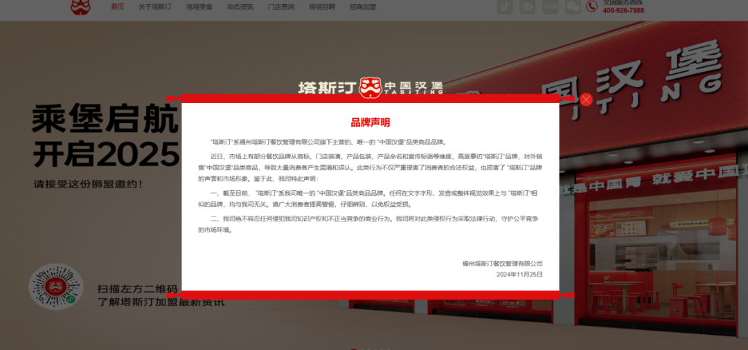 甚至点开塔斯汀官网,首先映入眼前的也是一张品牌声明信,称市场上有部分餐饮品牌从商标、门店装潢、产品包装、产品命名和宣传标语等维度,高度摹仿“塔斯汀”品牌,对外销售“中国汉堡”品类商品,导致大量消费者产生混淆和误认。