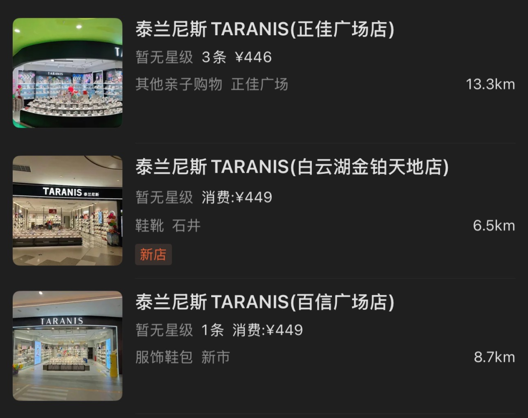 泰兰尼斯广州部分线下门店 | 截图来源于大众点评