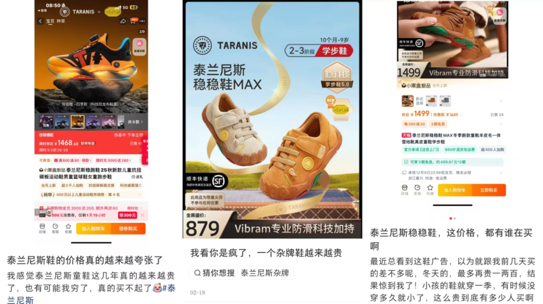 在不少老顾客眼中,以前的泰兰尼斯童鞋对孩子来说穿着舒适,不管鞋楦宽度还是材质用料都有出挑之处。同时,彼时的泰兰尼斯还算平价之选,平均一双价格在200-300元左右,折扣情况下还能更低,与其他童鞋品牌如江博士、基诺浦等几乎在同一档次。