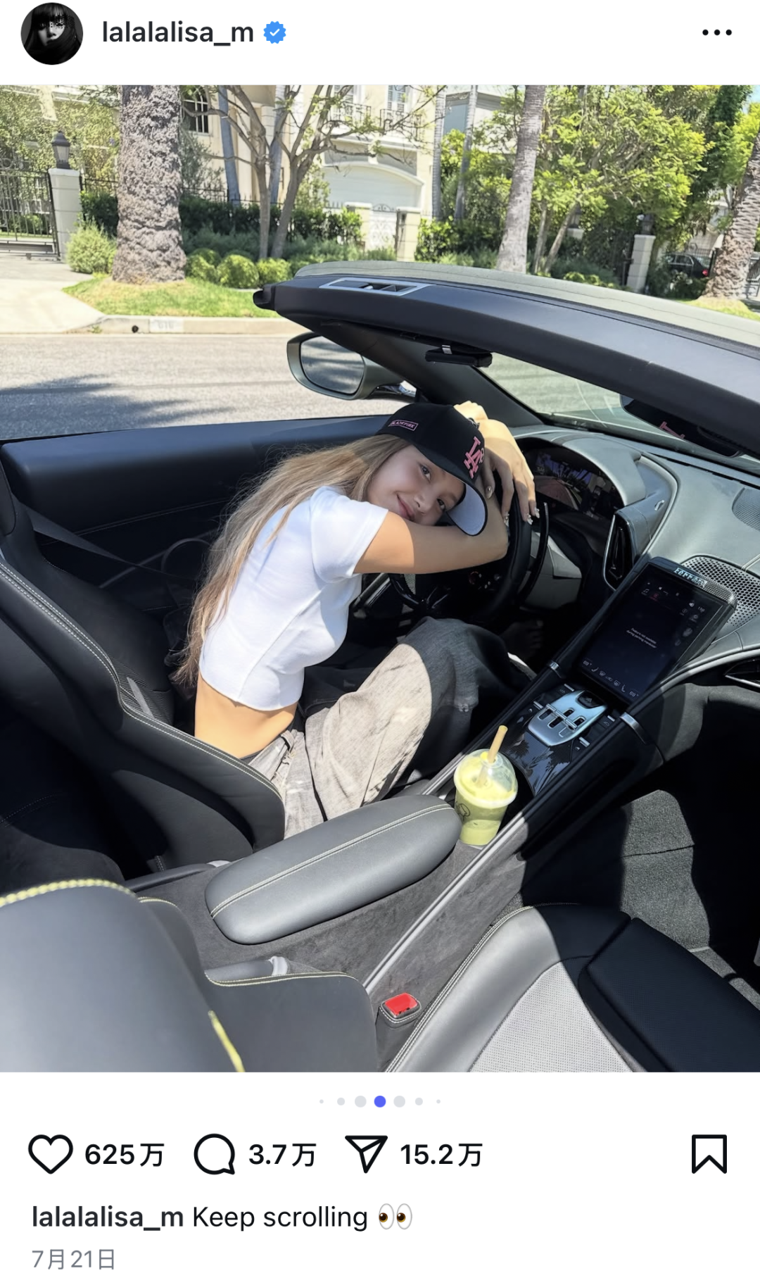 7月21日,lisa在ins上发布了一组图片,在美国洛杉矶,她松弛地趴在新车法拉利上,旁边是爱马仕和一杯绿色的奶茶。眼尖的网友发现,这杯奶茶是喜茶的新品“三倍厚抹”。