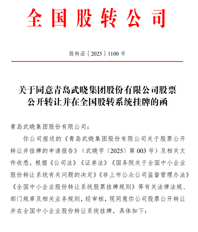 2025年6月13日,全国股转系统官网显示,武晓集团披露公开转让说明书,正式申请挂牌新三板。不到两个月的时间,武晓集团成功获批挂牌。