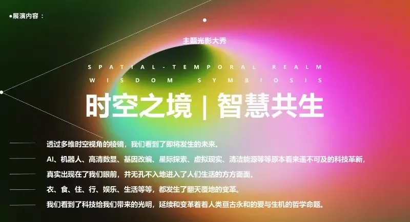 利用灯光、裸眼3D、全息投影、AI数字技术、交互设备、水雾技术等,结合中央草坪、廊架、滨水看台等,打造动态变化、展现交互艺术的“时空之境、智慧共生”光影秀。