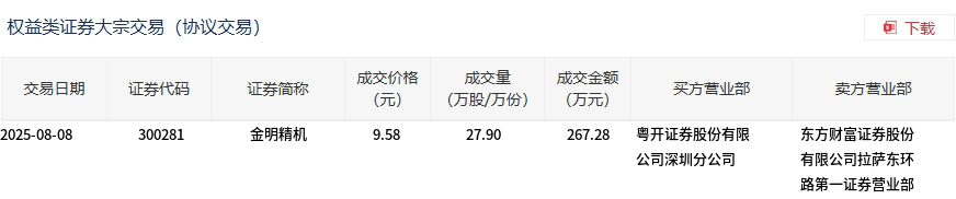 金明精机今日大宗交易溢价成交27.9万股,成交额267.28万元