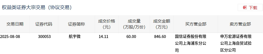 航宇微今日大宗交易折价成交60万股,成交额846.6万元