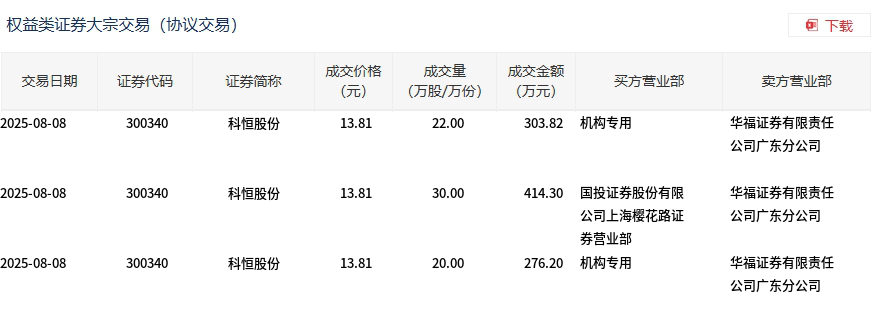 8月8日,科恒股份大宗交易成交72万股,成交额994.32万元,占当日总成交额的1.1%,成交价13.81元,较市场收盘价17.74元折价22.15%。