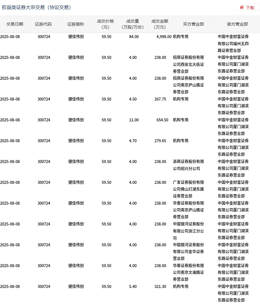 8月8日,捷佳伟创大宗交易成交141.6万股,成交额8425.2万元,占当日总成交额的3.63%,成交价59.5元,较市场收盘价67.28元折价11.56%。