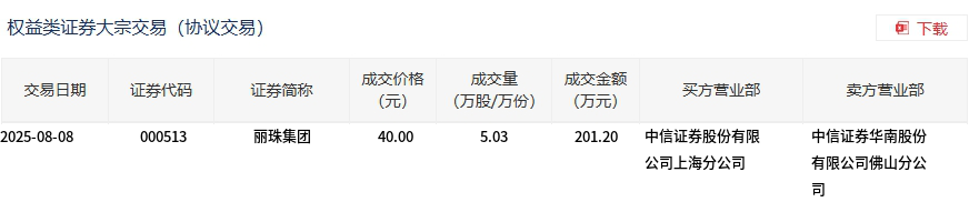 8月8日,丽珠集团大宗交易成交5.03万股,成交额201.2万元,占当日总成交额的0.76%,成交价40元,较市场收盘价40元持平。