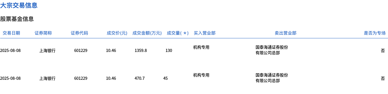 8月8日,上海银行大宗交易成交175万股,成交额1830.5万元,占当日总成交额的5.81%,成交价10.46元,较市场收盘价10.46元持平。