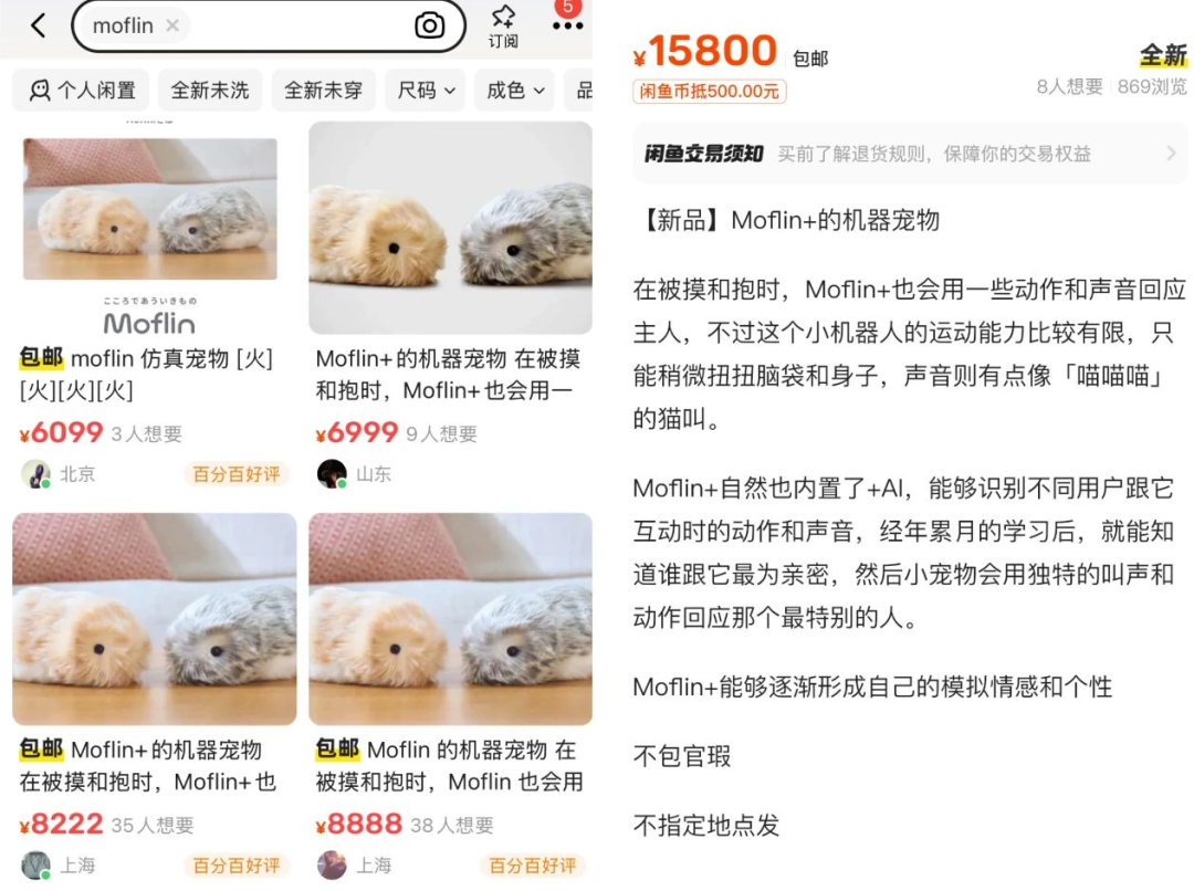 出圈产品售价在二手平台可能被炒到更高。去年11月,由卡西欧和Vanguard Industries共同打造的AI宠物Moflin,原价2800元仍销售火爆,官网断货后一度炒至上万元;字节跳动的AI陪伴玩偶“显眼包”由FoloToy打造,这个玩具本来是非对外售卖的礼品,却在二手平台上的转手价炒到500元。