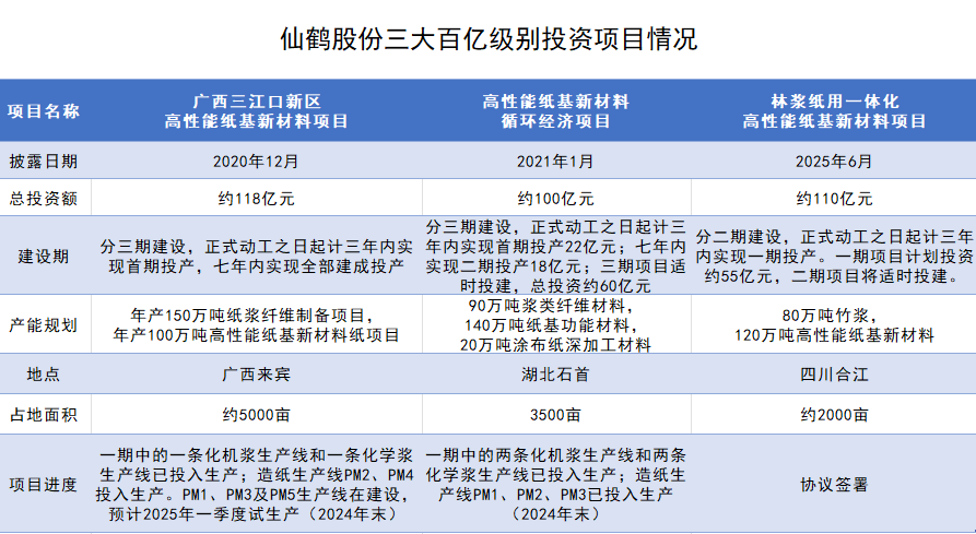 广西项目和湖北项目是仙鹤股份在2020年底和2021年初启动的,前者预计总投资约118亿元,后者预计总投资约100亿元。