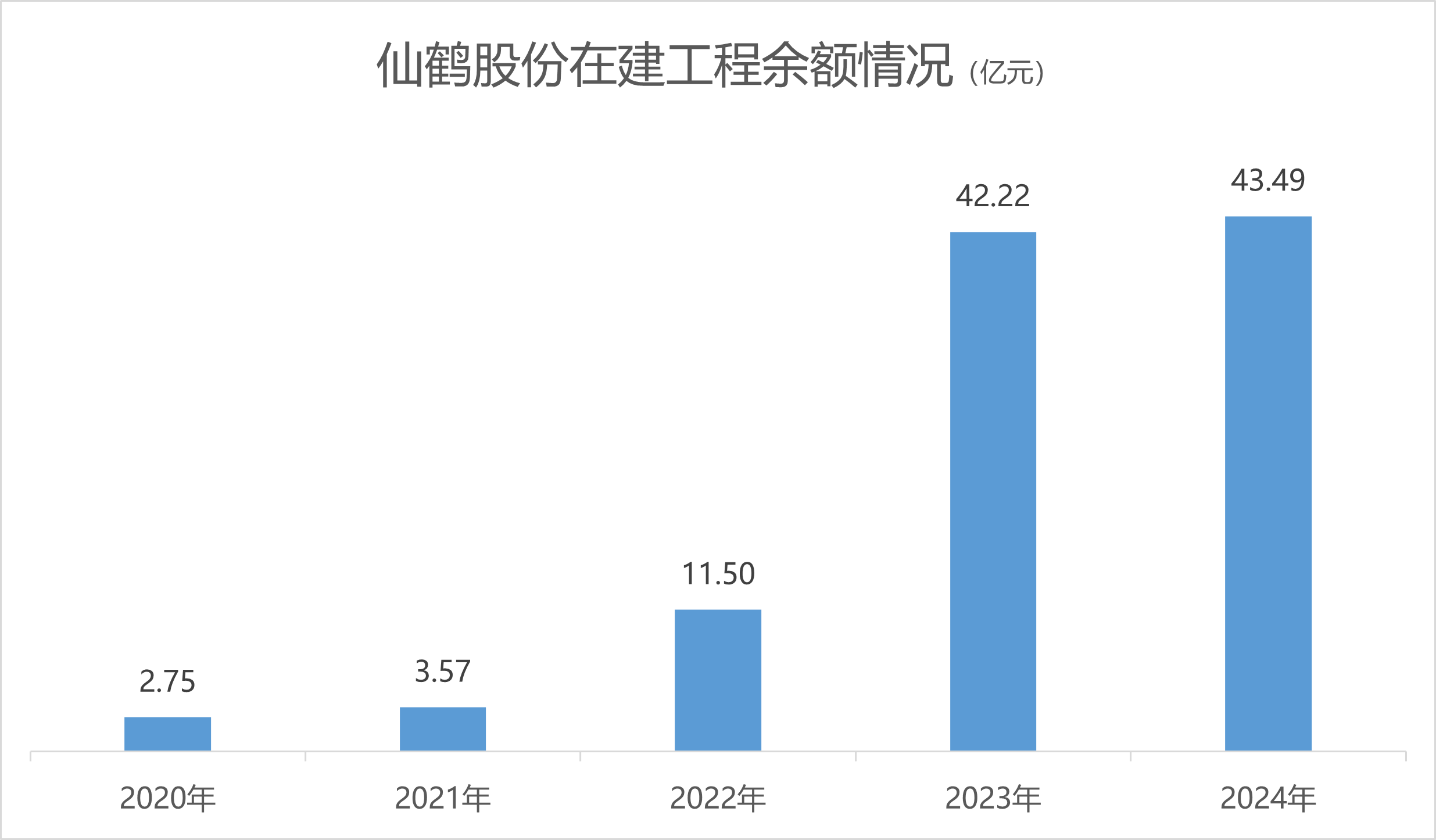 2021年末,仙鹤股份在建工程余额只有3.57亿元,到2023年末激增至42.22亿元。2024年年报显示,在当年有多达49.23亿元在建工程转固的前提下,去年年末,公司在建工程余额依然高达43.49亿元。
