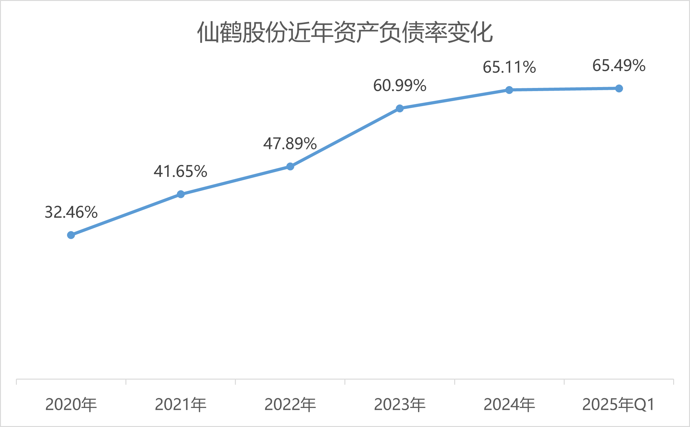 再次,资产负债率近几年在阶梯式上升。2020年末,公司资产负债率为32.46%,次年突破40%,到2023年末已突破了60%,截至2025年一季度末,公司资产负债率已高达65.49%,为近十年新高。