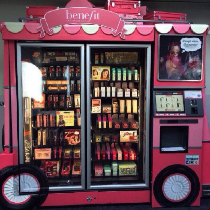 2013年,在美国的20多个主要机场,贝玲妃推出一款外观可爱、新颖,看似食物运输车的粉色化妆品售货机,宣称“为渴望美丽的旅行者提供可即时获取的30款最受欢迎的产品”。该机器设有触摸屏,用户可以根据界面挑选化妆品。与此同时,该售货机还有美容化妆技巧、短视频播放及互动功能。