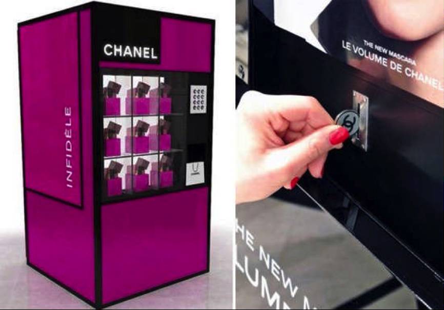 同年,香奈儿为了新品睫毛膏的推广,在伦敦塞尔福里奇百货推出了一款睫毛膏自动售货机。据称,在该设备上购买产品使用的硬币须是印有香奈儿LOGO的代币。这样的品牌植入,赋予了香奈儿代币购物与收藏双重价值。