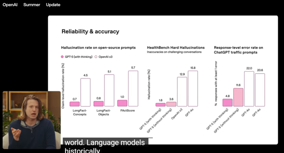 披露的数据表明,GPT-5在多个使用场景下的幻觉率相比前代模型有所下降。比如在联网搜索模式下,GPT-5的幻觉率比GPT-4o低约45%,而在深度思考模式下,幻觉率比o3低约80%。