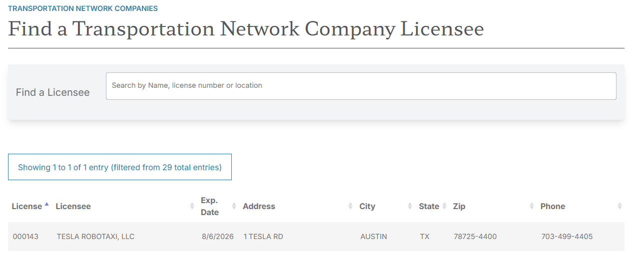 8月8日消息,美国得克萨斯州许可和监管部门(TDLR)官网显示,该机构已向特斯拉Robotaxi授予交通网络公司(网约车公司)许可证,为允许特斯拉在该州运营自动驾驶出租车铺平道路。(界面新闻 汪维喆)