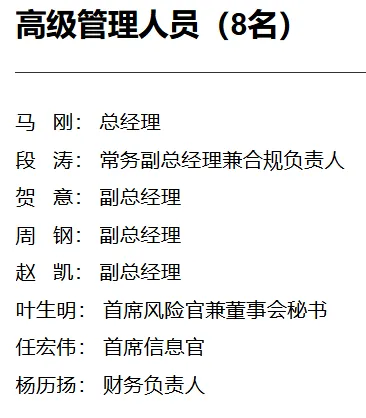 高管共8位,分别为总经理马刚,常务副总经理兼合规负责人段涛,副总经理贺意、周钢、赵凯,首席风险官兼董事会秘书叶生明,首席信息官任宏伟财务负责人杨历扬。