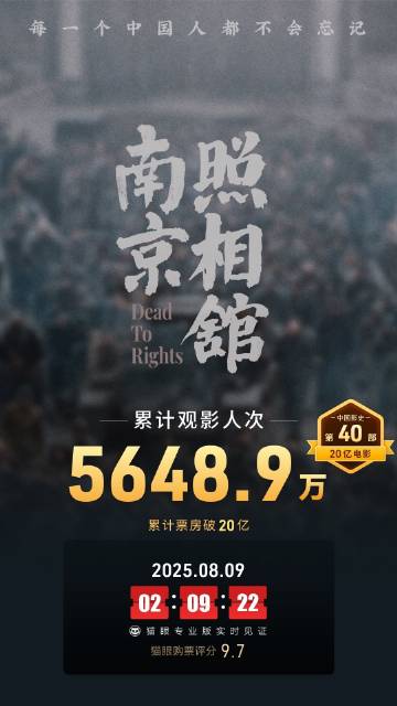 据猫眼专业版数据,电影《南京照相馆》上映16天,截至8月9日2时9分,总票房破20亿。