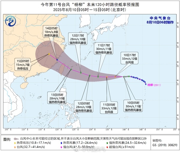 今年第11号台风“杨柳”(强热带风暴级)的中心今天(8月10日)早晨5点钟位于台湾台北市偏东方向大约1860公里的西北太平洋洋面上。预计,“杨柳”将以每小时20-25公里的速度向偏西方向移动,强度有所增强,并向台湾以东洋面靠近。(中国天气网)